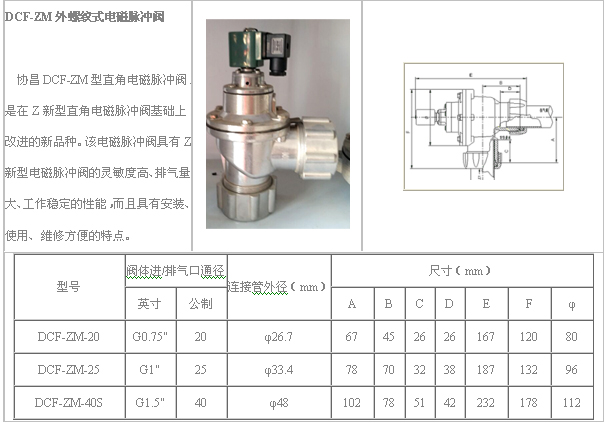 外螺紋式電磁脈沖閥,外螺紋電磁閥是一種外螺紋連接結(jié)構(gòu),是在Z型直角電磁脈沖閥基礎(chǔ)上改進(jìn)的品種。該電磁脈沖閥具有Z型電磁脈沖閥同樣的靈敏度高、排氣量大、工作穩(wěn)定的性能,具有安裝、維修方便,使用可靠的特點(diǎn)。